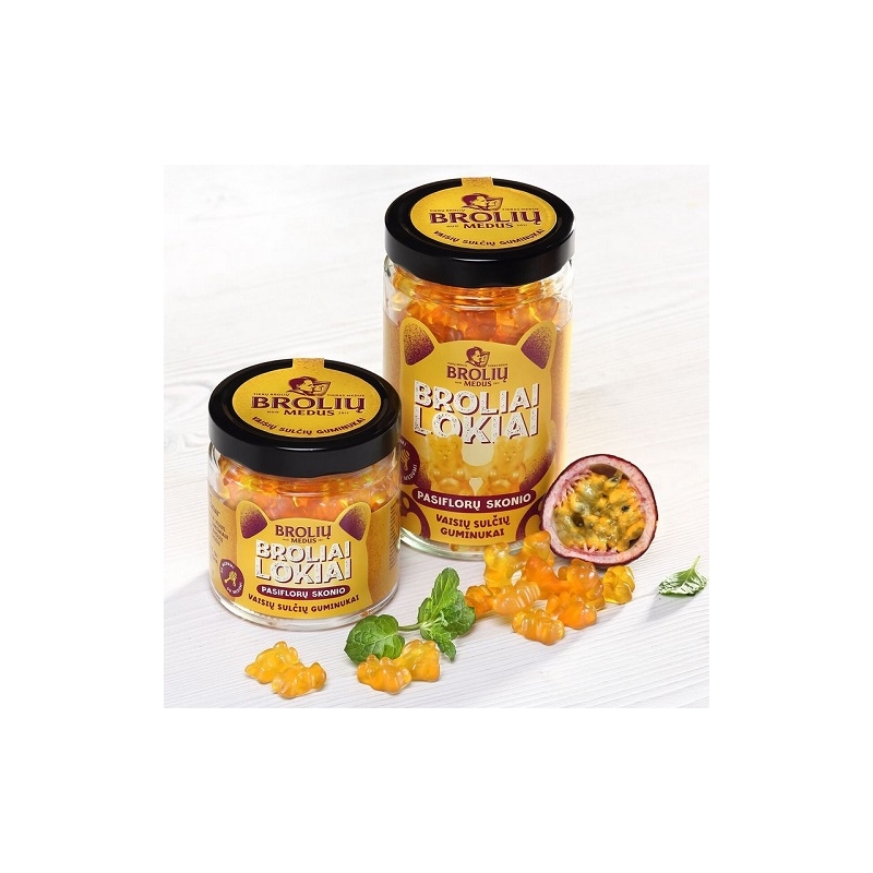 - egzotiškų pasiflorų sultys - suteikia guminukams švelnaus rūgštumo ir vaisiško saldumo: